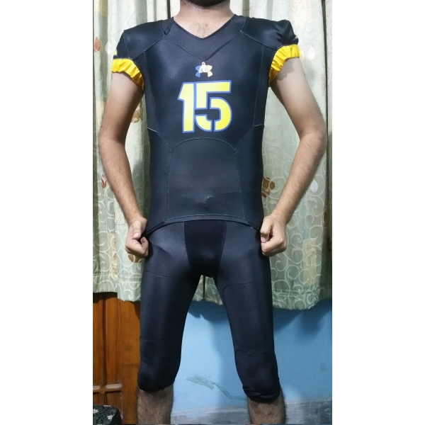 Description 4 way Stretch Fabric 100% Polyester High quality Football Uniform made with Polyester Lycra, spandex fabric for State league clubs, Universities, Colleges and Schools. Full sublimated Names, Numbers and Logos. American Football jersey double layer on the shoulder 350 GSM Compression body spandex mesh side panel.